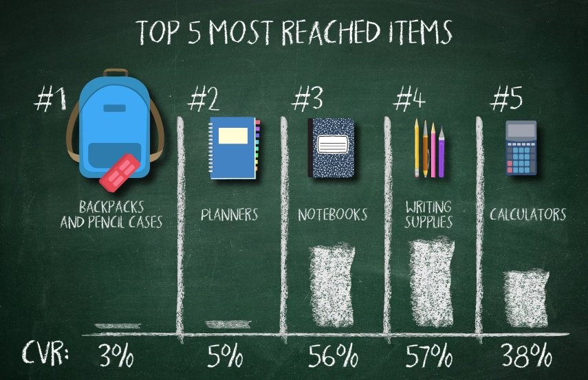 事实上,当谈到转化率时,热门商品就会发生变化。背包和手账成为了转化率最低的产品,分别为3%和5%。而转化率最高的商品是书写文具,达到57%,其次是笔记本(56%)和计算器(38%)。