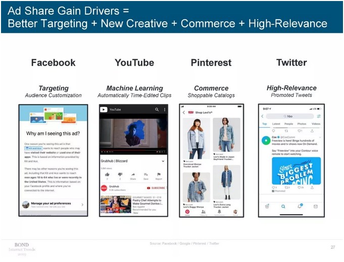 三、用户习惯 知己知彼,百战不殆 报告阐述了互联网用户、用户习惯的现状 了解你的客户才能更好地获客 快看看你的潜在客户平时都喜欢干什么 1.全球互联网用户 全球互联网用户增长稳定,但增速变缓,目前增长6%,2017年同期同比增长7% 全球互联网用户达38亿人,超过全球人口的50% 2.数字媒体使用率 下图是美国每位成人用户每天花在数字媒体上的时间 同比增长7%,2017年同期同比增长5% 3.移动设备使用率 2019年,美国人每天在移动设备上花费的时间达到了226分钟,首次超过了电视端。 4.平台在线时长 下图是全球范围内不同互联网平台的用户占比情况 可以看到:YouTube 和 Instagram 的用户增长迅速 YouTube 和 Instagram 用户的增长,给跨境卖家们带来了非常有利的推广机会。 我们可以把握好YouTube 视频营销 & Instagram 社交营销的力量,尤其是 Instagram 引入了更深层的购物机制,新增一键下单功能。 5.视频&短视频的发展 下图是美国用户每日在数字和电视端的视频观看时长 数字视频的观看时长在5年内增长一倍,目前占比28% 短视频的发展更为迅猛,以Facebook Stories为例, 拥有15亿日活跃用户,一年内增长了一倍 无论是从这份报告,还是从我们平时看到的现象,都不难发现,目前社交媒体有着从看图向看视频的逐渐转变。 作为卖家,在推广过程中,我们可以抓住用户的这一习惯,通过吸引目光的优质视频/短视频广告进行营销推广。 四、互联网广告 作为跨境卖家 难免会接触到产品的营销推广、广告投放 接下来看看互联网广告的发展现状 1.互联网广告支出 下图是2010年和2018年美国人花费在印刷媒体、电台、电视、PC端、移动端等不同媒体上的时间百分比,以及广告主在各类媒体的广告支出百分比。 可以看到,从2010年到2018年,移动端媒体的使用量大幅增加,广告主的广告支出同样增长迅猛。 这无疑说明了移动互联网广告的重要性,跨境卖家们也可以把握好移动互联网广告的优势,推广自己的产品。 2.互联网广告平台 下图是不同互联网广告平台的营收对比(基于美国的广告平台营收) Google 和 Facebook 一马当先,但一些新媒体如 Snapchat、Pinterest 也增加了自己的市场份额。 这说明除了Google 和 Facebook,一些新媒体广告平台也受到广告主的欢迎。 在投放广告的时候,我们可以不仅仅局限于头部媒体,也可以尝试在一些新媒体上进行广告。 报告也阐述了不同广告平台各自的优势,大家可以根据自己产品的特点来选择广告投放的平台。 Facebook: 针对性强,定制化受众 YouTube: 机器学习,自动剪辑片段 Pinterest: 商务性强,有购物目录 Twitter: 高相关性,推广推文