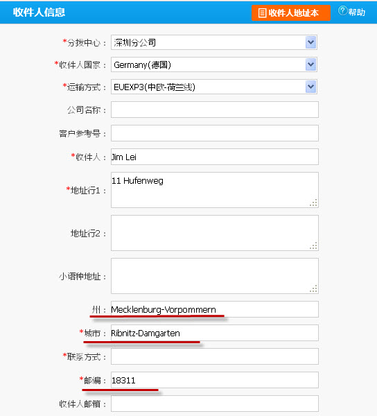 为避免因地址问题导致包裹无法正常发出或者派送失败,您在录入EUEXP3订单时,地址栏只可填写街道、门牌等信息,不能填写国家、州、城市、邮编。国家、州、城市、邮编需在正确位置填写。以下方地址为例: