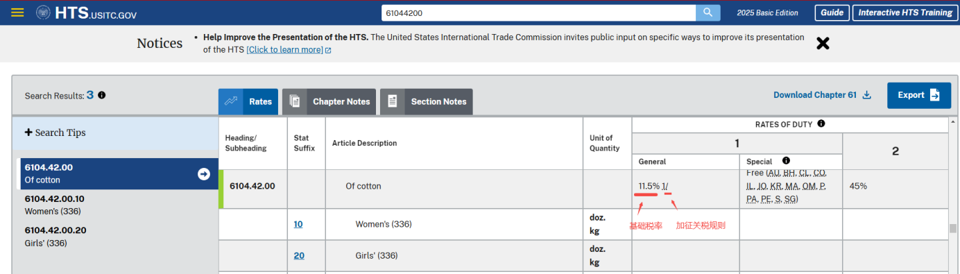 例如:HS Code为6104420010、6104420020的产品,基础关税税率11.5%;301条款加征税率:7.5% ;0204加征关税:10%,合计总税率:29%。
