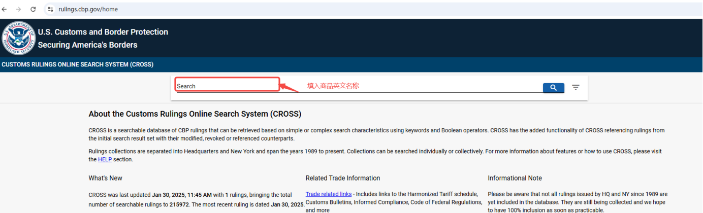 美国HS Code查询方法:登录网址https://rulings.cbp.gov/home,输入英文商品名称进行查询。