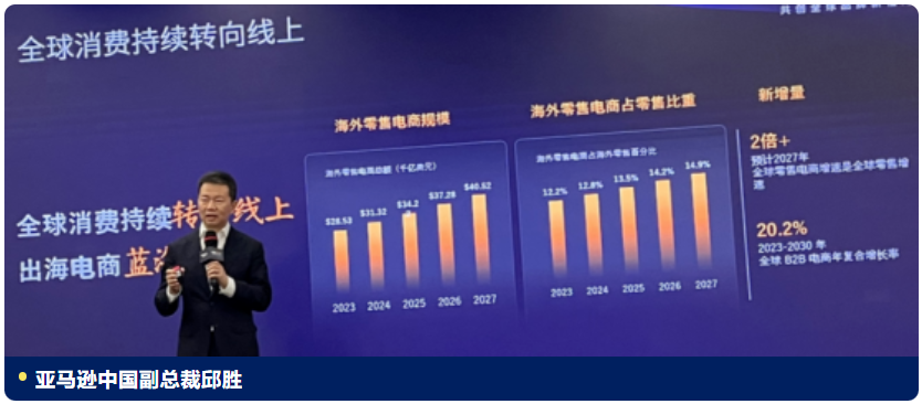 大会开场,亚马逊中国副总裁邱胜分享行业前景发展,讲述全球消费持续转线上,预计2027年全球零售电商增速约2倍及以上,2023-2030年全球B2B电商年复合增长率约20.2%。