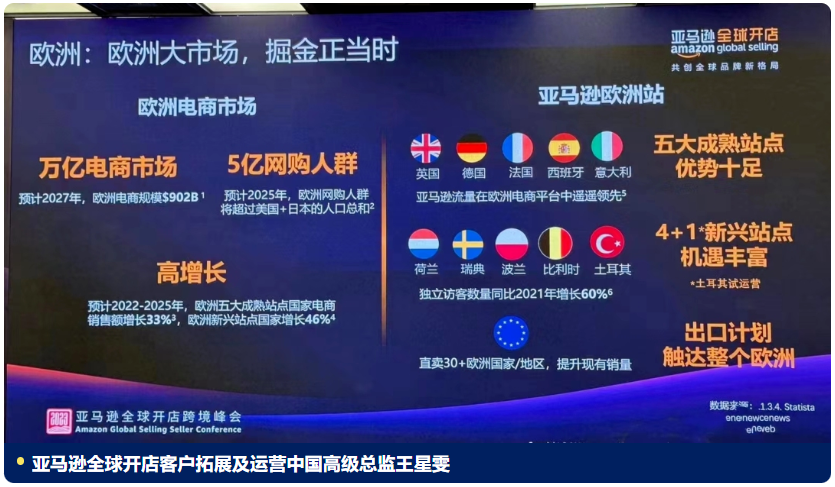 大会上与亚马逊站点发展、物流需求相关内容,由亚马逊全球开店客户拓展及运营中国高级总监王星雯和物流与仓储亚太高级产品总监陈鸣分享。全方位展示亚马逊19大海外站点发展历程,再次点明23年正式开放巴西站点的消息。