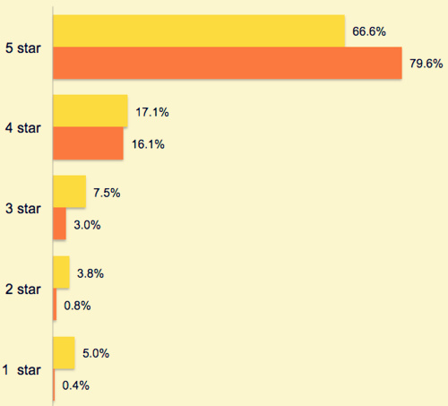 消费者渐渐开始怀疑那些评论的真实性。最近一项关于700多万条评论的研究显示,受到奖励的reviewer撰写的产品评论星级比没有奖励的高,满分5星的情况下,前者是平均4.74星,而后者是4.36星。
