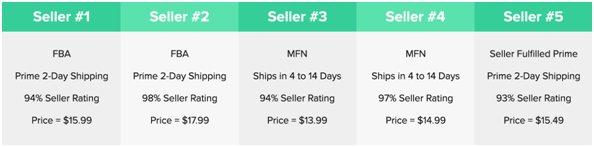 因为亚马逊的Buy Box算法非常复杂,所以这里用一个例子来说明会更清楚。为了简单起见,在这个例子中,我们将只关注前四个最重要的亚马逊卖家指标。