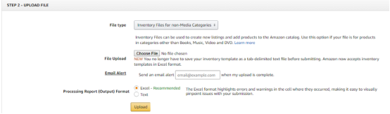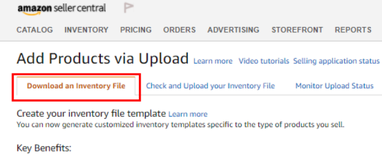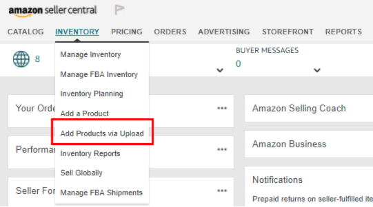 完成后,返回卖家中心(Seller Central),点击“Inventory”( 库存)>“Add Products via Upload”(通过上传添加产品)。