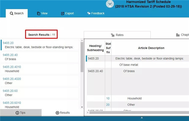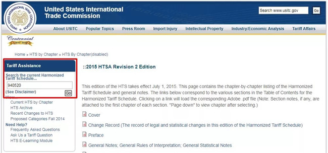 1.查询HTS CODE:进入上述网站,在Tariff Assistance项下Search the current Harmonized Tariff Schedule...下的搜索框中输入输入中国HS CODE的前六位数,如台灯940520****,搜索结果页面的左边框有详细的HTS CODE,根据自己的产品选择HTS CODE。