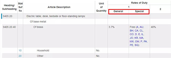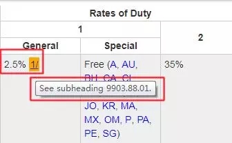 继续我们在上一步对HTS码的查询,针对具体产品,可以看到在“Rates of Duty”处有好几栏,究竟应该看哪一栏呢?