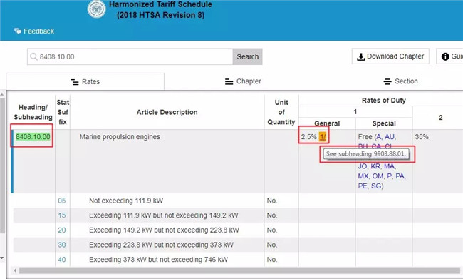 我们以税号为“8408.10.00”的船用推进发动机为例演示,这项产品被列入了160亿美元的加税清单中,此前它的进口税率在“General”处显示是2.5%。但它后面跟着一个“1”,显示让我们再去查看“9903.88.01”这个副标题。