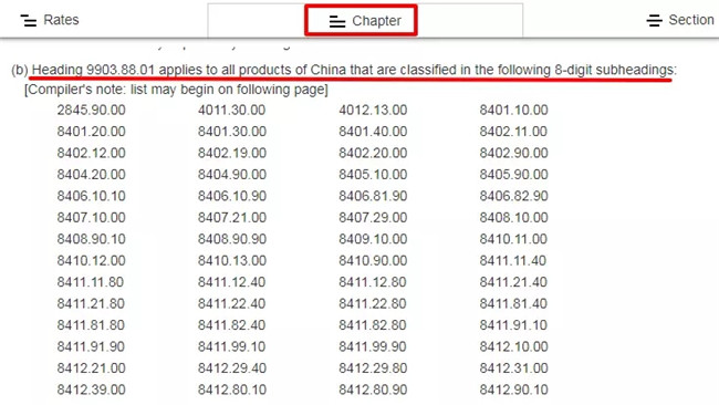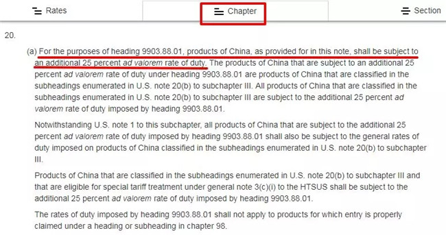 继续在网页中查询“9903.88.01”,这里就明确提及,这一部分的中国产品在适用税率基础上再加25%。