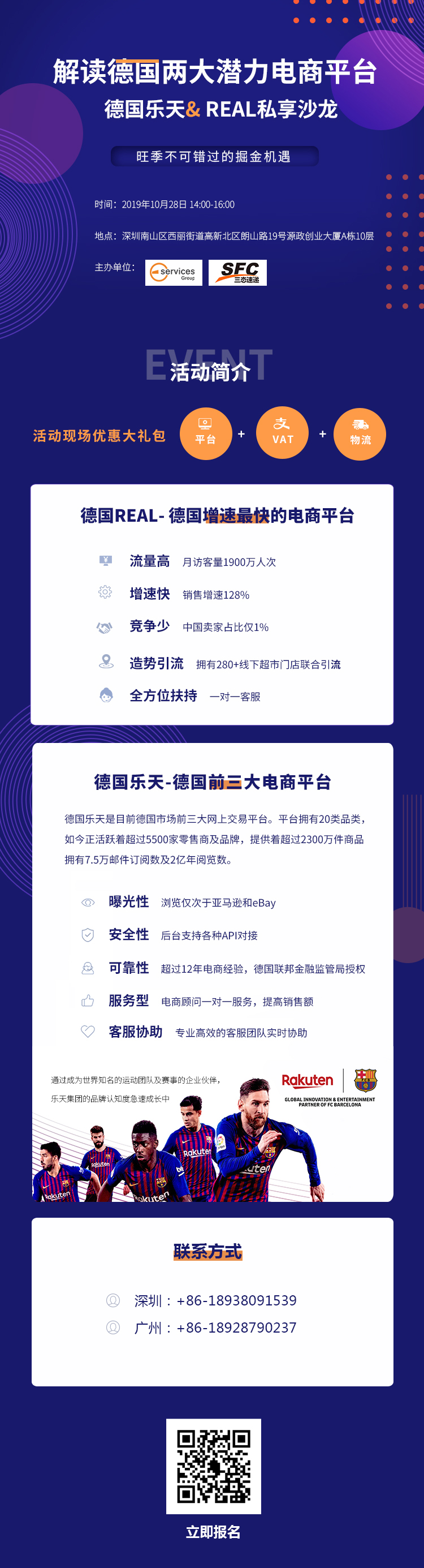 针对Real.de和德国乐天两大德国潜力平台,三态速递和EGS特别举办了“德国乐天 & Real”私享沙龙,为中国卖家详细解读这两大潜力电商平台,并为现场观众送上
