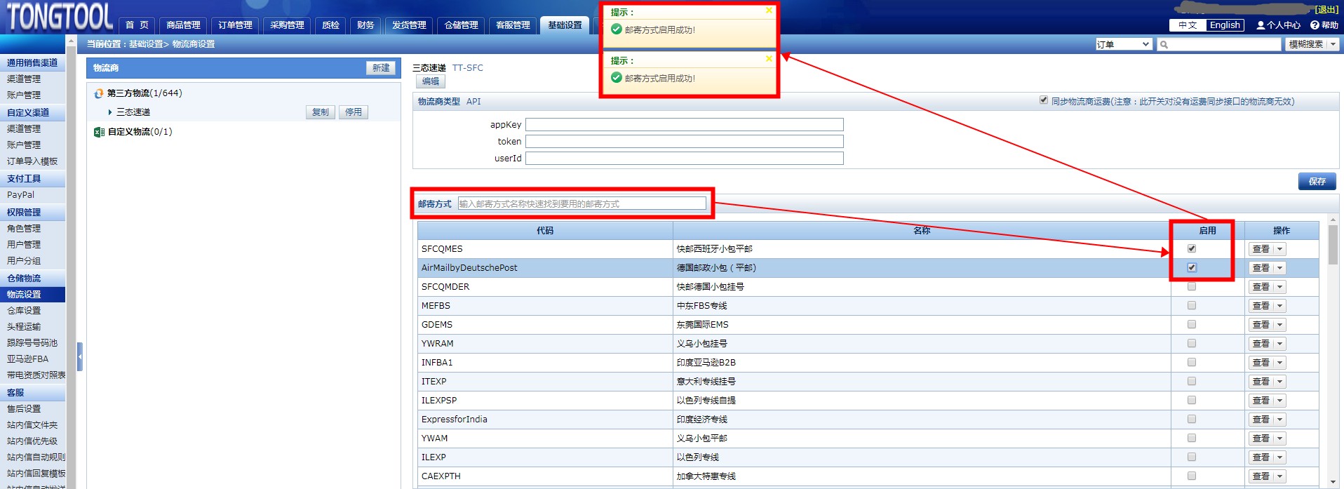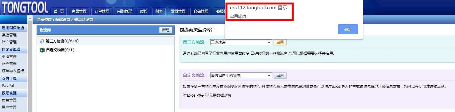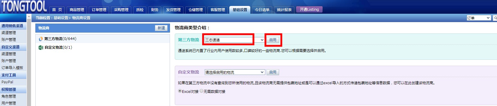 4、在页面右上部分“第三方物流”里输入“三态速递”并选择后点击启用。