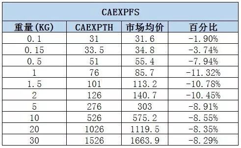 而将它与市场价作比对,CAEXPFS在0.4kg-30kg区间的价格也比市场价低7%-11%不等!
