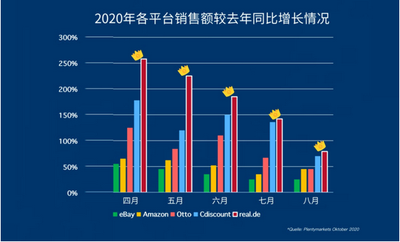 real.de是全德增长最快的电商平台,年增长率超过德国电商市场的6倍,与同类型的平台相比,real.de一直遥遥领先于竞争对手,2020年以来,不仅是德国,在欧洲电商热门平台中,Real都始终处于竞争的领先位置,并仍然增长强劲,前途不可估量。