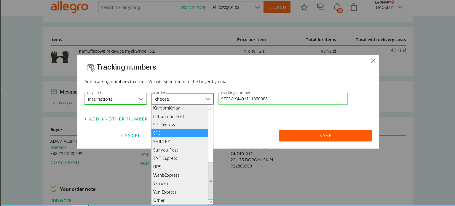 三态速递(SFC)是Allegro 官方认可的物流服务商,为平台卖家提供高效稳定的三态波兰专线服务,卖家发货下单时,可在后台物流选择三态速递SFC标记发货,如图所示: