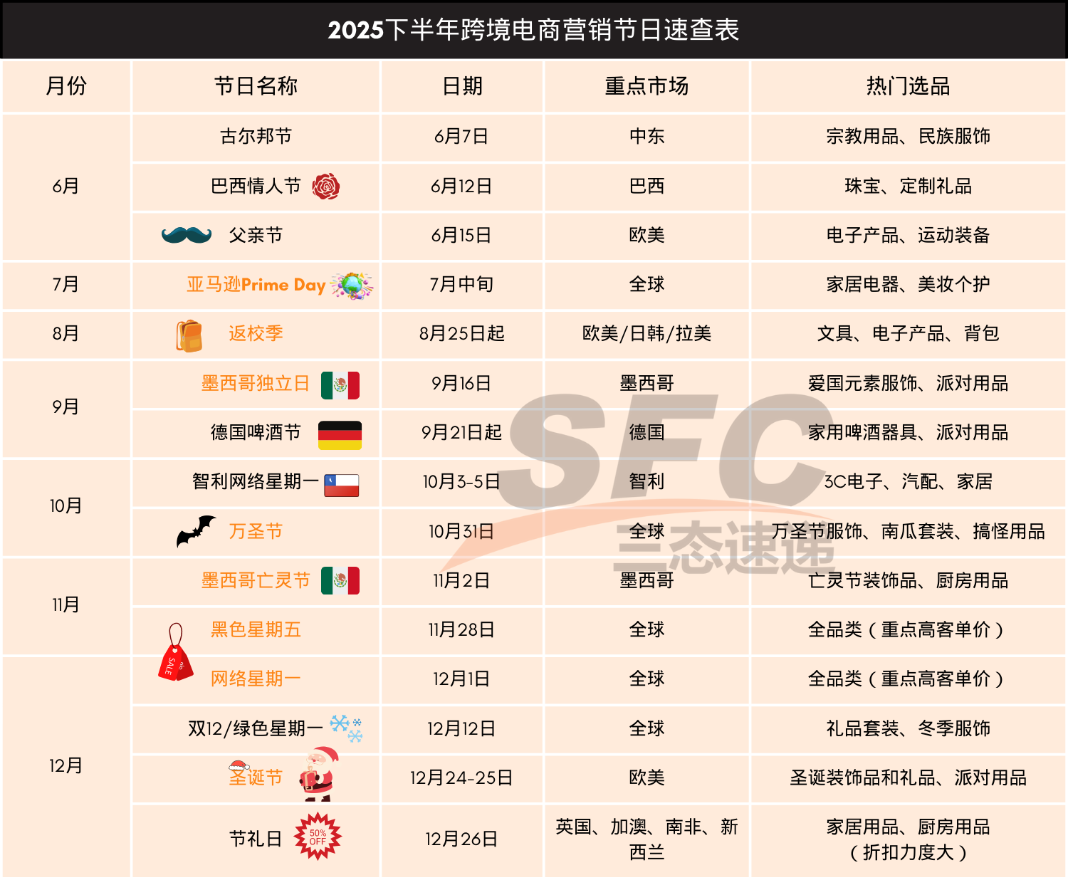 阅读本文,三态速递(SFC)整理2025年6-12月关键海外节日与平台大促活动时间,旨在帮助跨境卖家精准卡位流量爆发点,为旺季做好营销准备! 6月:多元文化促销季启幕