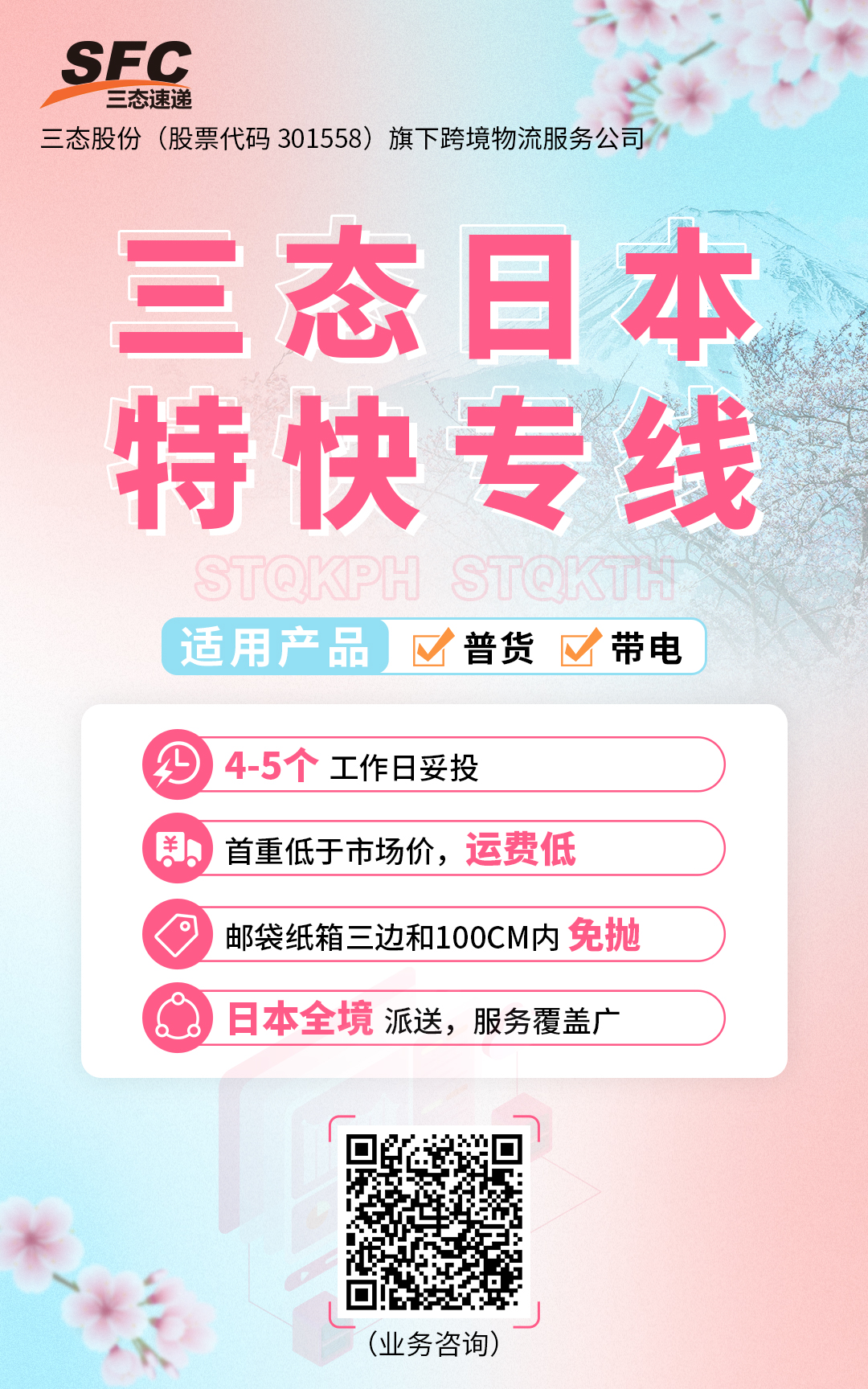 如您想了解三态日本特快专线运费及渠道详情,请联系您的三态速递负责客户经理,或扫下方二维码在线咨询,我们将竭诚为您服务,提供日本专业高效的一站式自发货物流方案。