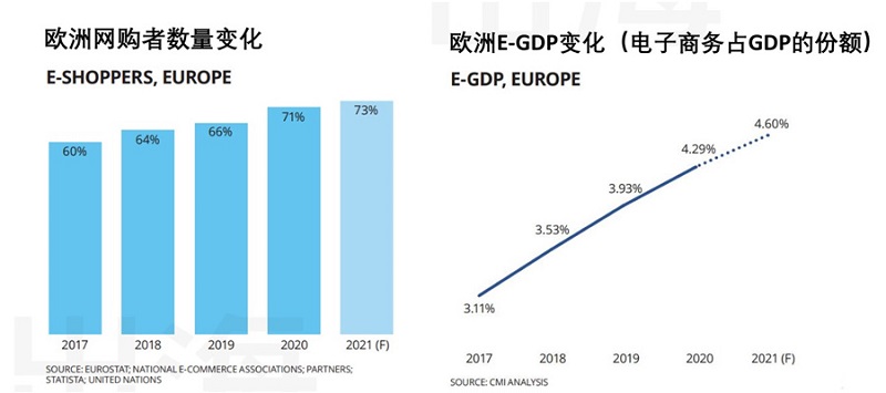 欧洲电商市场经济的GDP呈现不错的增长势态,进一步带动电子商务的持续增长。预计在2022年欧洲电商市场将会有更大的爆发潜力,是电商卖家把握机会入驻的好时机。