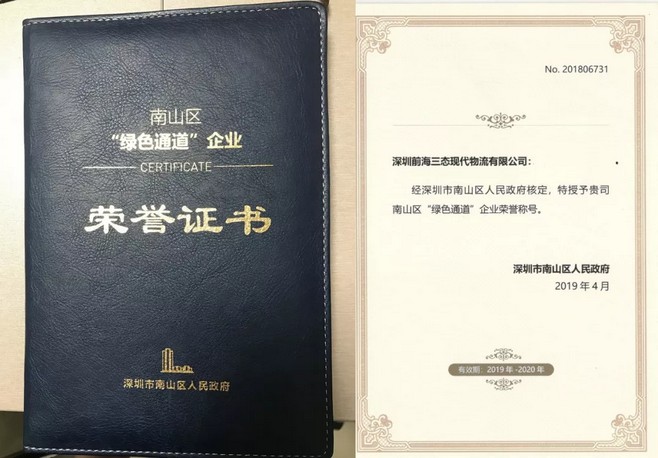 深圳市南山区对辖区经济社会发展做出突出贡献的纳税百强企业代表进行表彰,作为深圳市领军跨境物流企业,三态速递被正度正式认定为《南山区“绿色通道企业”》并获荣誉证书。