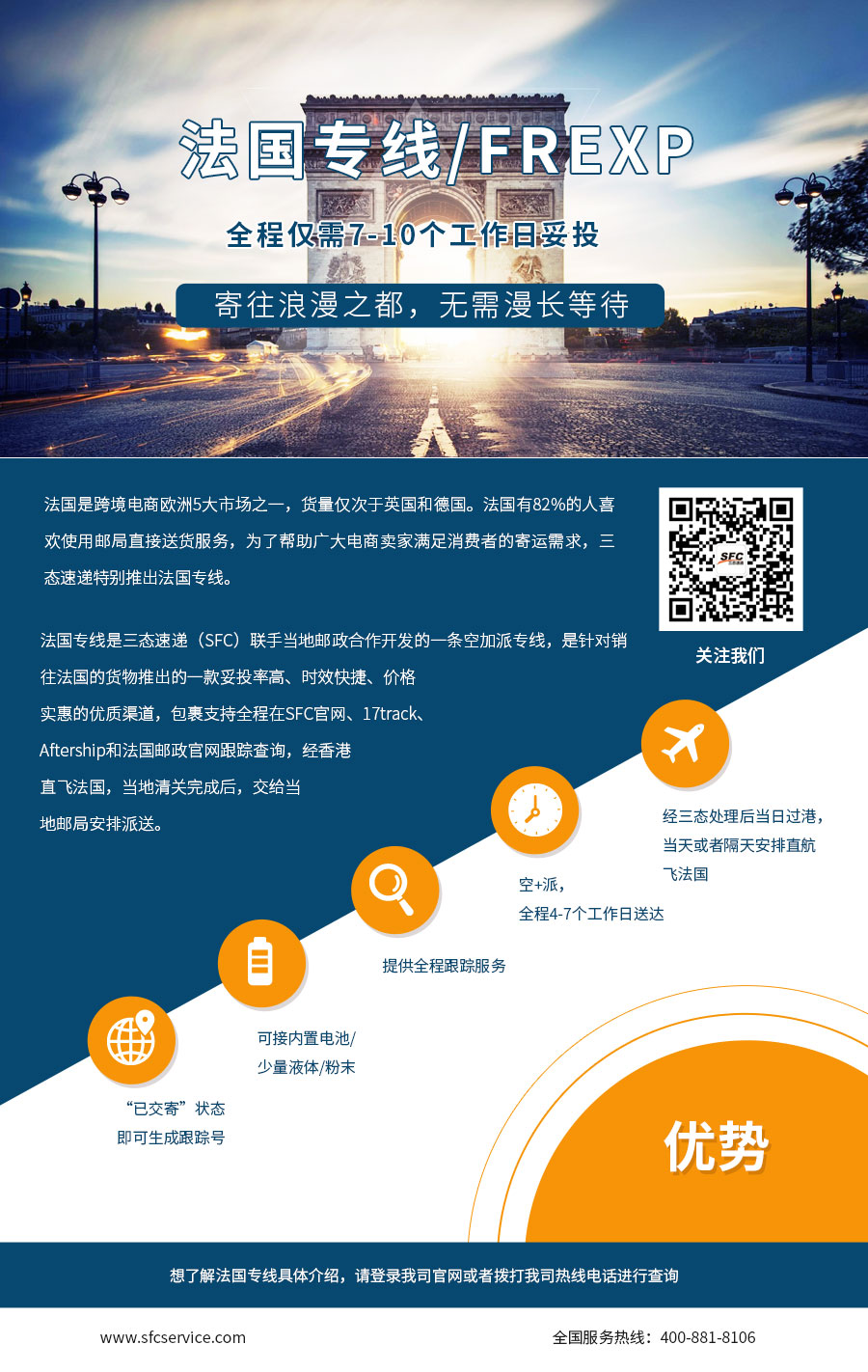 为了提升广大跨境电商卖家对寄往法国的物流服务体验,三态速递在经过专业的市场调研与渠道开发后,终于成功开通了适合寄运轻小件(2KG以内),并且支持内置电池和寄运少量液体粉末物品的空加派专线服务。该服务由香港直飞前往法国,在当地完成清关后,交由本地邮政负责最后一公里派送。极大程度提升了包裹的妥投率,全程时效只要4-7个工作日。