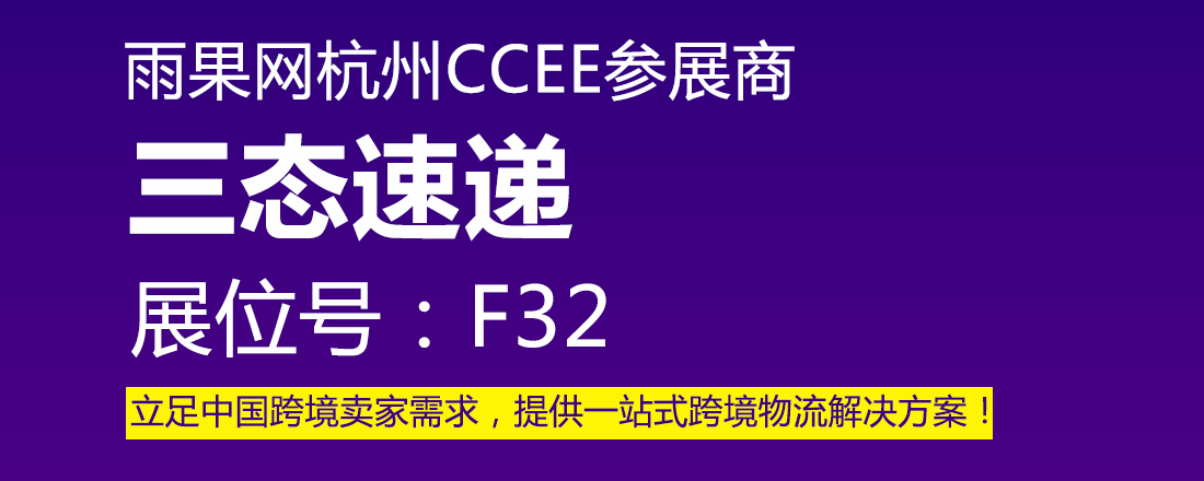 作为专业的跨境物流解决方案的供应商,三态速递一直专注跨境卖家需求,降低卖家物流成本,用行动不断升级服务,助力卖家在跨境路高歌前行。作为雨果网CCEE的老朋友,三态速递很期待再次在杭州与各位卖家朋友相遇,一起聊聊跨境路上的甘与甜。