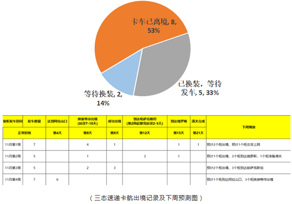 11月1日-11月28日,三态速递共发出15批卡航,目前8批已离境,5批等待发车,2批等待换装,未出境的批次也将在下周陆续离境。