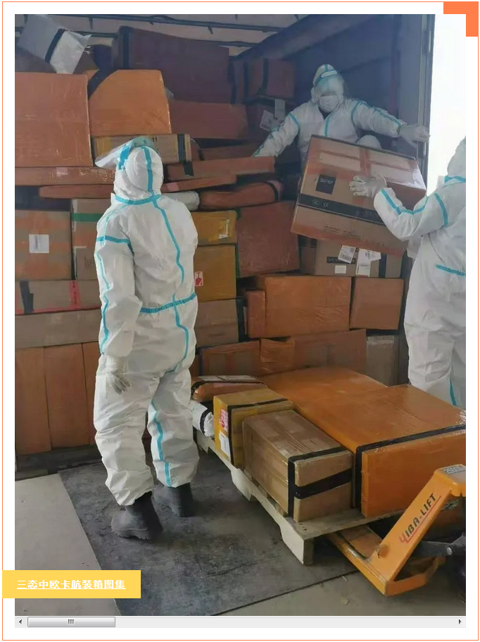 截止目前为止,三态速递中欧卡航的班次都在正常运行中,不受阿拉山口拥堵影响,在最新班次装箱现场图中,可以看到装箱司机身穿防护服正有序作业。