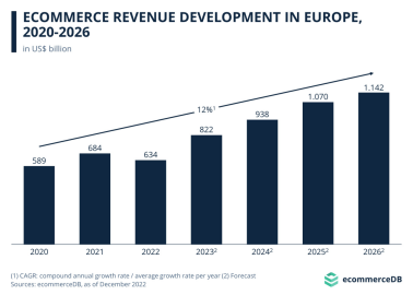 市场规模:ecommerceDB发布最新的欧洲电商趋势报告,预测欧洲电商市场2026年或可突破万亿规模。