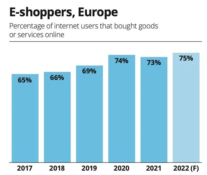 网购原因:根据《2022年欧洲电子商务报告》数据,欧洲网民近年来网购的比例逐年增长,2017-2022年逐渐从65%提升至75%。