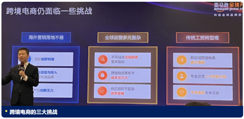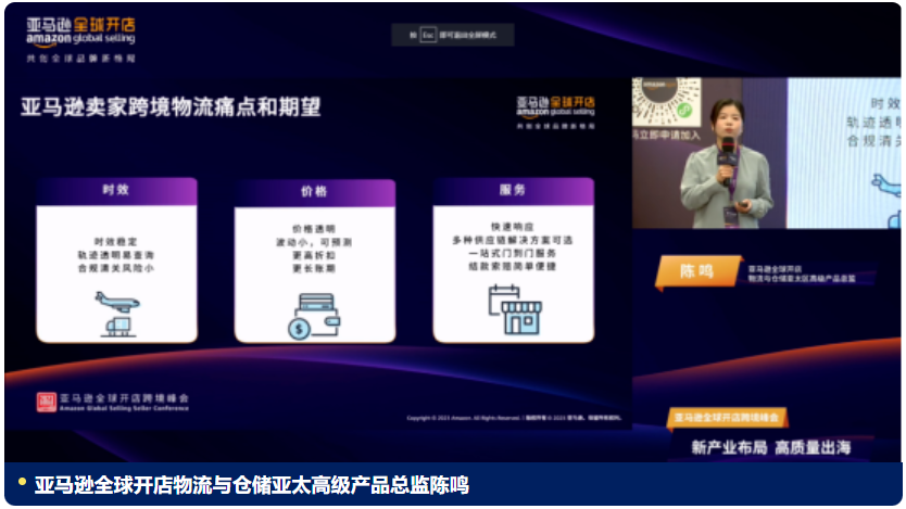 亚马逊全球开店物流与仓储亚太高级产品总监陈鸣 还从物流上,总结亚马逊卖家对跨境物流的需求(痛点)和期望,贯彻在服务(全面性)、价格和时效(稳定性)等三大维度。