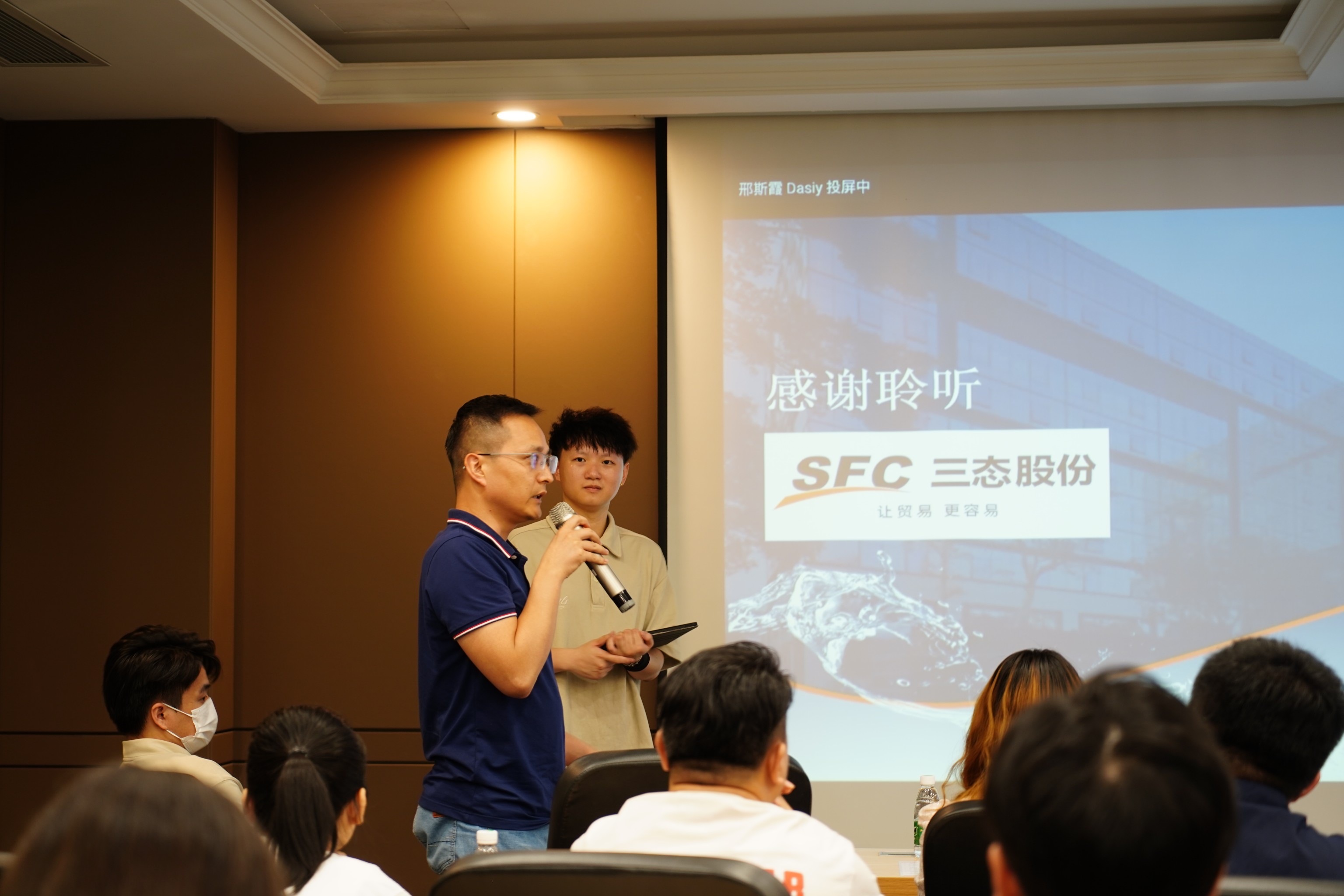 开场发言结束后,由三态速递市场负责人Jenny Fang分享三态股份的业务模式、发展历程和业务优势。多角度介绍三态股份自创业到上市的重大发展阶段,其中有政府认可获得的物流电商企业荣誉、有独具竞争力的核心产品线及先进的仓储物流系统。